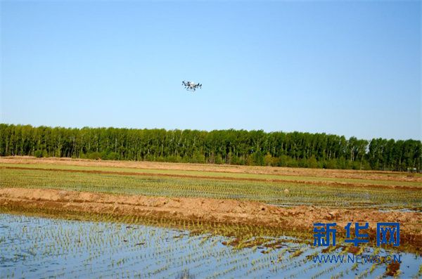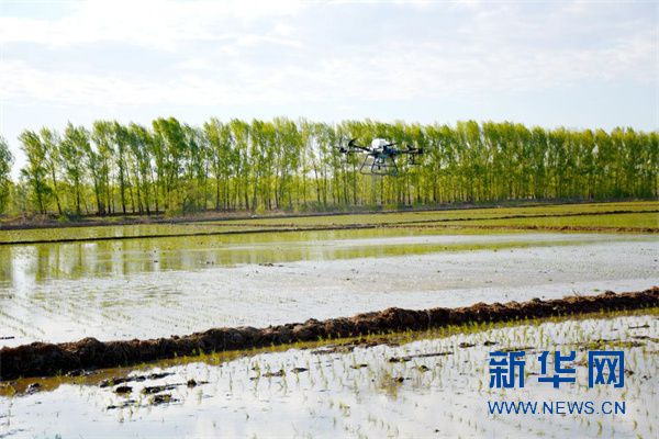 新华网哈尔滨5月18日电(记者王建)18日,在黑龙江北大荒农业股份有限公司江滨分公司南岗管理区种植户王龙家地里,一台农用无人机正在进行喷施水稻返青肥作业。