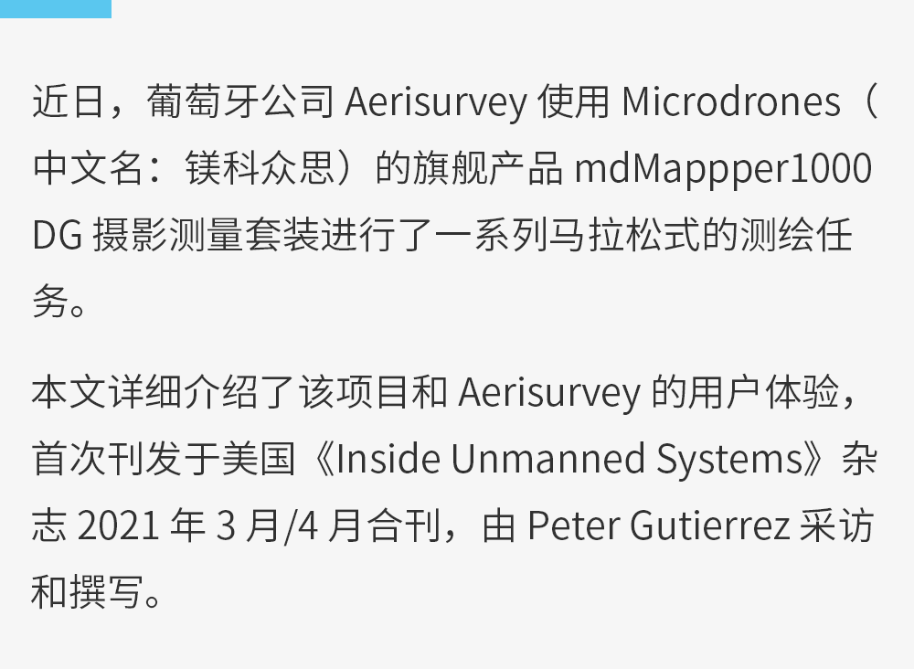 Santos表示,在mdMapper1000DG的所有功能中,最令人印象深刻的是直接定向功能(Direct Referencing)。这是一种将航拍图像与地表的对应地理位置关联起来的高效方法,通过获取传感器的真实3D坐标和方向角实现。直接定向功能可以直接绘制地图,精度比传统的空中三角测量、RTK和PPK更高。Santos介绍:“直接定向模块叫Applanix APX-15 UAV DG,带有测量级GNSS(全球导航卫星系统)接收器和经过精确校准的测绘用IMU(惯导系统)。”Microdrones系统的可靠性在业内闻名遐迩,这也是促使Aerisurvey成为Microdrones客户的主要原因之一。“此外,系统的结构和使用非常简单,我认为这是最难做到的。我们现在90%的工作都在使用mdMapper1000DG设备,但实际上我们使用了整个Microdrones系统。从计划到执行和数据处理,全部包含在同一个系统中,大幅度改进了工作流程。”