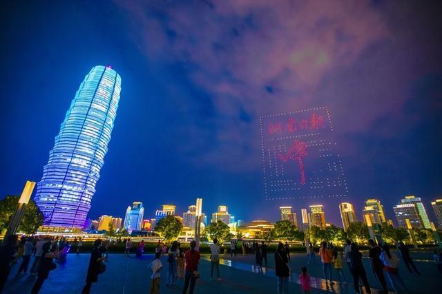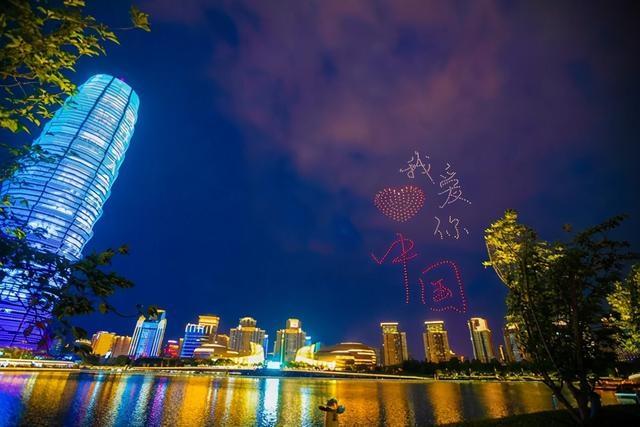 河南商报记者看到,上千架无人机在夜空中不断变换阵型,通过在飞行过程中不断变换出的“我爱你中国”“华表红丝带”“二七塔、CBD地标”“数字河南智能机器人”“河南日报 中”“点亮中原‘豫’你共赞”等画面,致敬伟大的祖国、为出彩中原点赞。