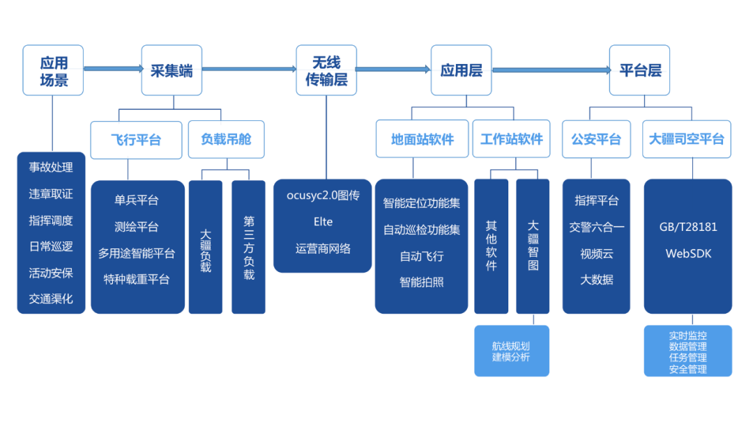 由采集端、无线传输层、应用层、平台层等组成的无人机交警应用解决方案体系,构成了智慧交警的应用闭环。
