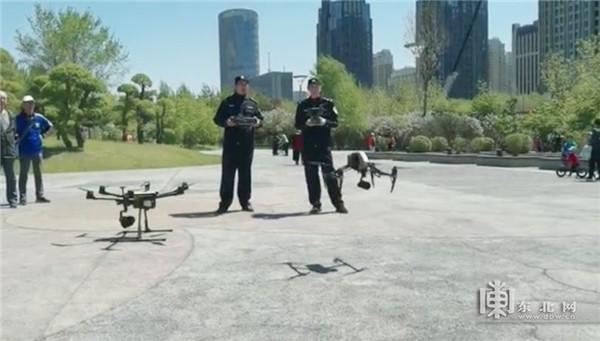 这是哈尔滨市公安局道里分局创新宣传工作举措,出动警用无人机携带广播,参与预防打击电信网络诈骗工作。