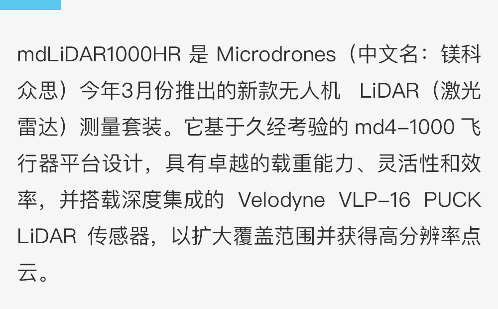 mdLiDAR1000HR能够基于16线扫描技术收集高密度数据。与单线激光雷达相比,它更快、更高效。它配备90°视场角,获得更高的点密度和树冠穿透能力。因此在数据后处理过程中,地面分类程序的执行精度比低密度点云更高。通过mdInfinity数据平台,用户可创建逐层校准流程,不仅提高点云精度,还能过滤LiDAR数据来提高点云质量,从而实现比同类产品更佳的点云精度和准确性。