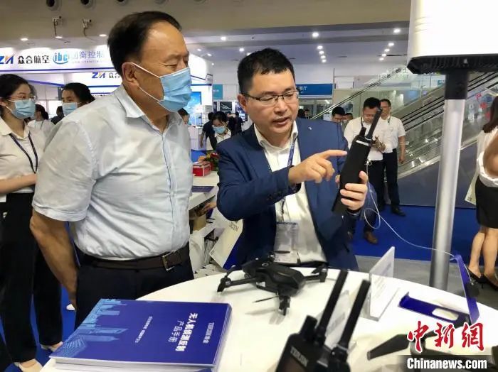 21日至23日,2021第五届世界无人机大会举行。上海特金无线技术有限公司董事长姜化京(右)在展示。 石修文 摄