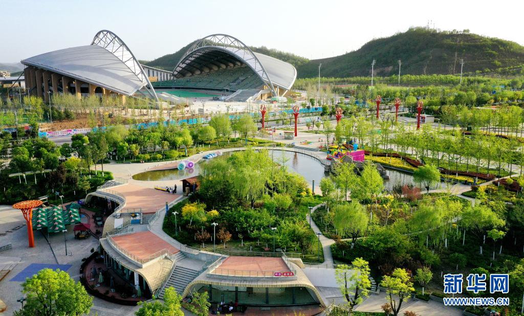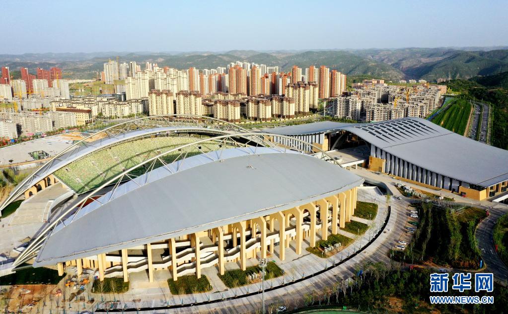 5月8日拍摄的延安新区全民健身运动中心(无人机照片)。新华社记者 刘潇 摄