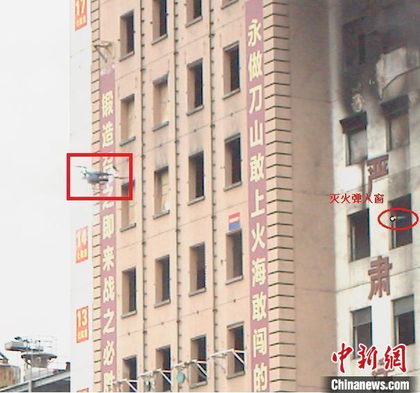 中新网北京5月27日电 (徐晓 郭超凯)“3、2、1,发射!”随着话音落下,无人机携带的灭火弹应声射出,精确命中指定的窗户,抛洒超细干粉灭火将室内火情压制;同时将火情信号传递给正在待命的第二架无人机,第二架无人机在一分钟之内完成第二枚灭火弹的发射与灭火剂抛洒,成功将火情扑灭随即无人机平稳返航。近日举行的一场无人机灭火系统真实场景演练赢得热烈掌声,现场500余名消防官兵观摩了整个灭火过程。