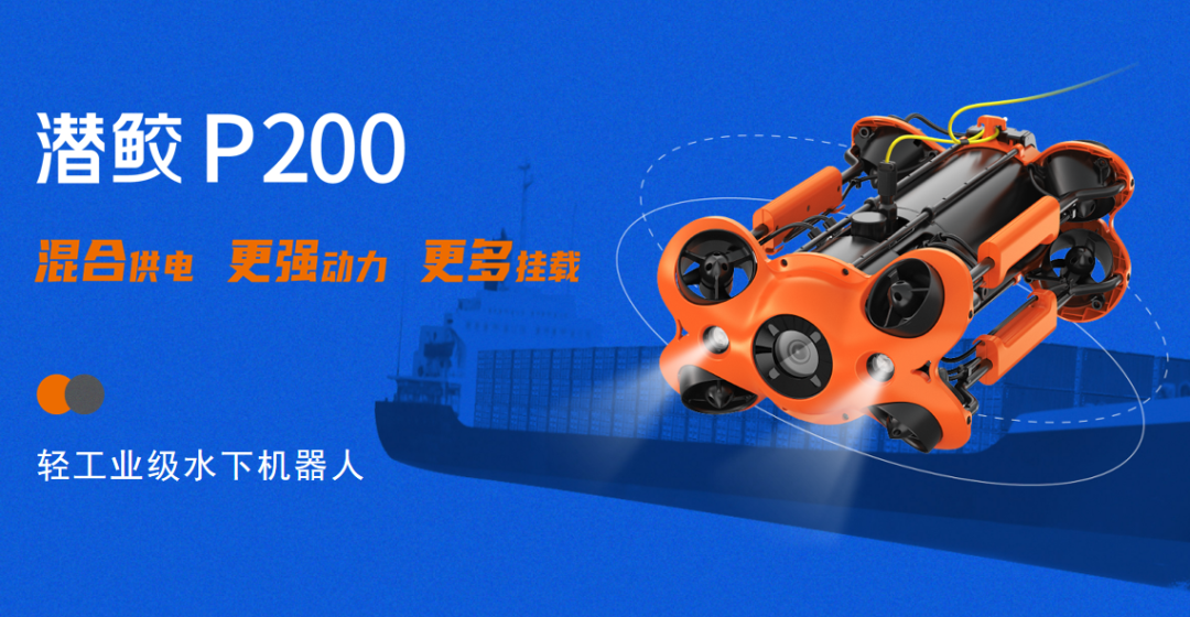 潜鲛 P200是采用8推进器全矢量布局,360度全方位移动。相比潜鲛P100,电机功率升级50%,最大航速1.5m/s、深度150米、最大水平半径400米。可支持AC交流电和电池混合供电,实现无限续航。