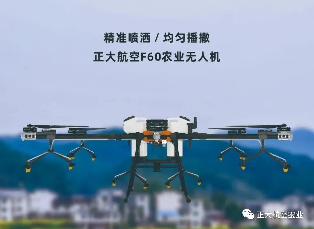 正大航空F60无人机,采用了斜向环抱式结构,折叠后体积大幅缩小,便于用户转场运输。36寸的航空折叠桨,最大拉力可达26.6Kg。整机采用的是IPX7的防护等级,一体注塑成型机臂和吸能框架结构使得机身强度提升了38%。整机的模块化等级提升90%。其采用的是正大航空首创的双药箱设计,电池位于药箱中间机身上部,45°插播专利使得用户拆装更加方便。