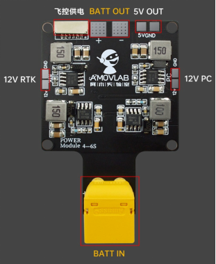 本电源模块为无人机/无人车多路供电特别定制,尤其是搭载板载计算机、或者RTK、或者图数传、或者其他传感器等需要12v、5v供电的需求。相比于传统电源模块本电源模块具有4路输出,将4路电源集成到一块电路板上极大的增加了空间利用率,避免了无人机内部的走线凌乱,对于搭载多传感器需要多路供电的的无人机/无人车来说是个不错的选择。