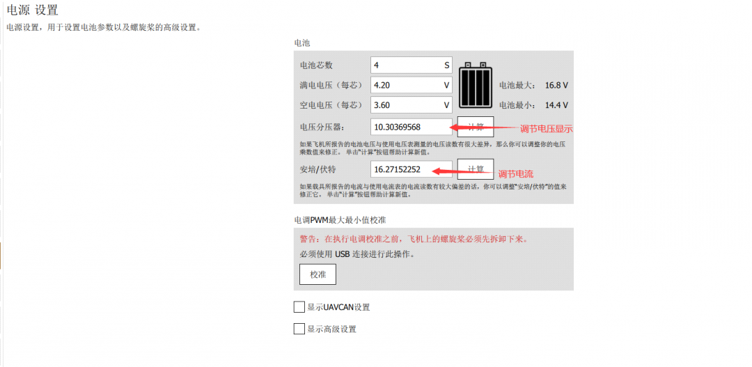 这里是QGC地面站中的电源设置,可根据实际情况来改变“电压分压器”(微调电压地面站中的显示)电压测量可使用万用表或bb响测电器等工具测量电压。
