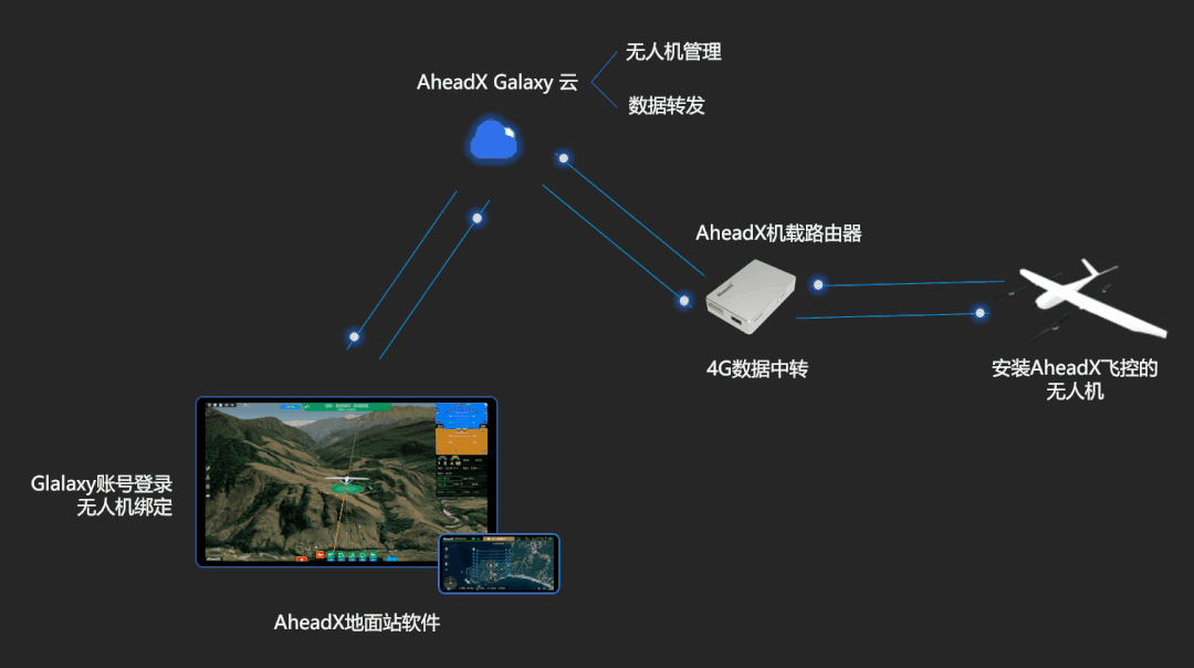 用户仅需登录AheadX Galaxy云端账号,即可自动搜索到名下使用4G和双备份数据链的无人机。