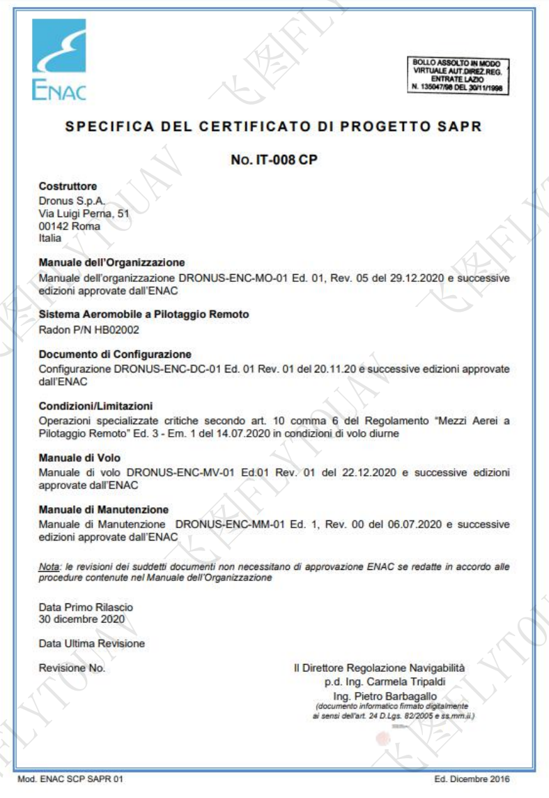 经过3年的努力,中国无人机企业广州飞图信息科技(飞图FLYTOUAV)的Radon机型(国内型号横空™6Air无人机)近期获得欧洲适航认证。并与欧洲伙伴Dronus一起交付首批7台Radon至意大利Leonardo.S.p.A公司。Leonardo公司是全球十大防务承包商之一,是全球航空航天,国防和安全领域重要参与者,Leonardo公司积极参与全球各国政府公共安全事务,包括搜索、救援以及医疗运输服务。