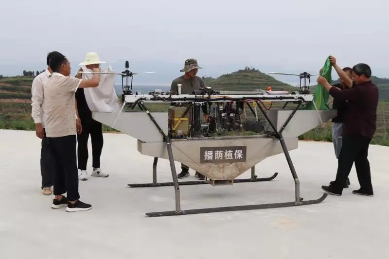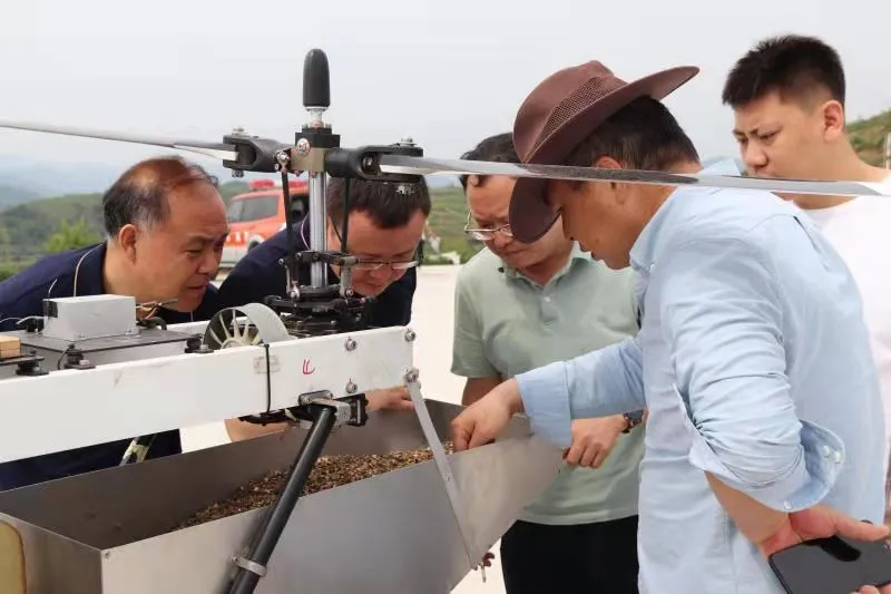 6月9日上午9时,一架双旋翼油动型无人机携带100余斤种子在滔河乡横岭河播区的平台上腾空而起,定向定量撒向环库荒山,拉开了2021年淅川飞播造林的序幕。