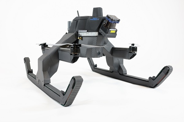所以Pegasus不完全是地面移动机器人,也不完全是无人机,它介于两者之间。它的设计功能是这样的:当飞行时,无人机的两个着陆脚上升并作为螺旋桨的保护装置。当它降落时,着陆架离地,就可以像坦克履带一样运作。为了让机器人能在各种地形上提供动力,当遇到地面障碍物可以通过小型跳跃飞行来解决。
