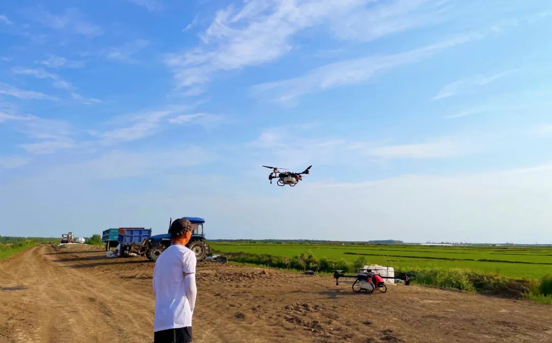 在黑龙江佳木斯同江市,下午 2 点的勤得利农场阳光明媚,地广人稀。不远处的水稻田边上轰鸣声不断。只见两架极飞 P80 农业无人机在田埂上蓄势待发,飞手超哥在忙碌地进行着作业前准备。