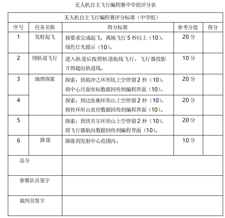比赛共分为两个阶段,第一阶段为现场编程调试阶段,第二阶段为程控飞行阶段,每名选手有2次飞行机会。