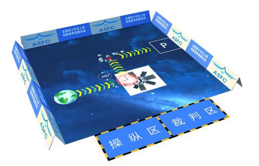 1.小学组场地如图五,竞赛场地为6m×6m的方形模拟“宇宙”,区域内有起飞点、A、B两个路径点和P区域,其中起飞点为我们生活的地球,A点为空间站,B点为陨石带,P为降落区。场地环境为室内正常白昼光。
