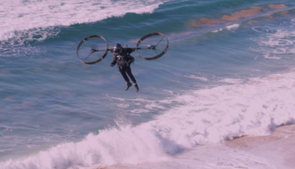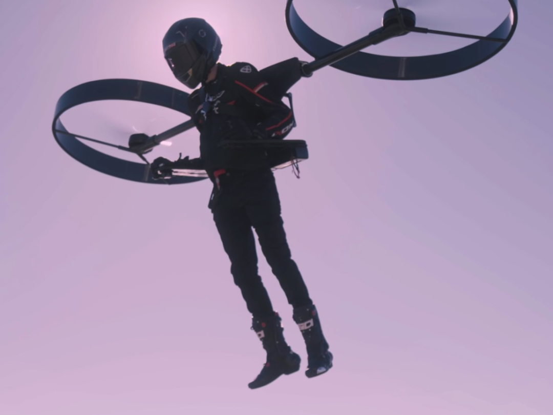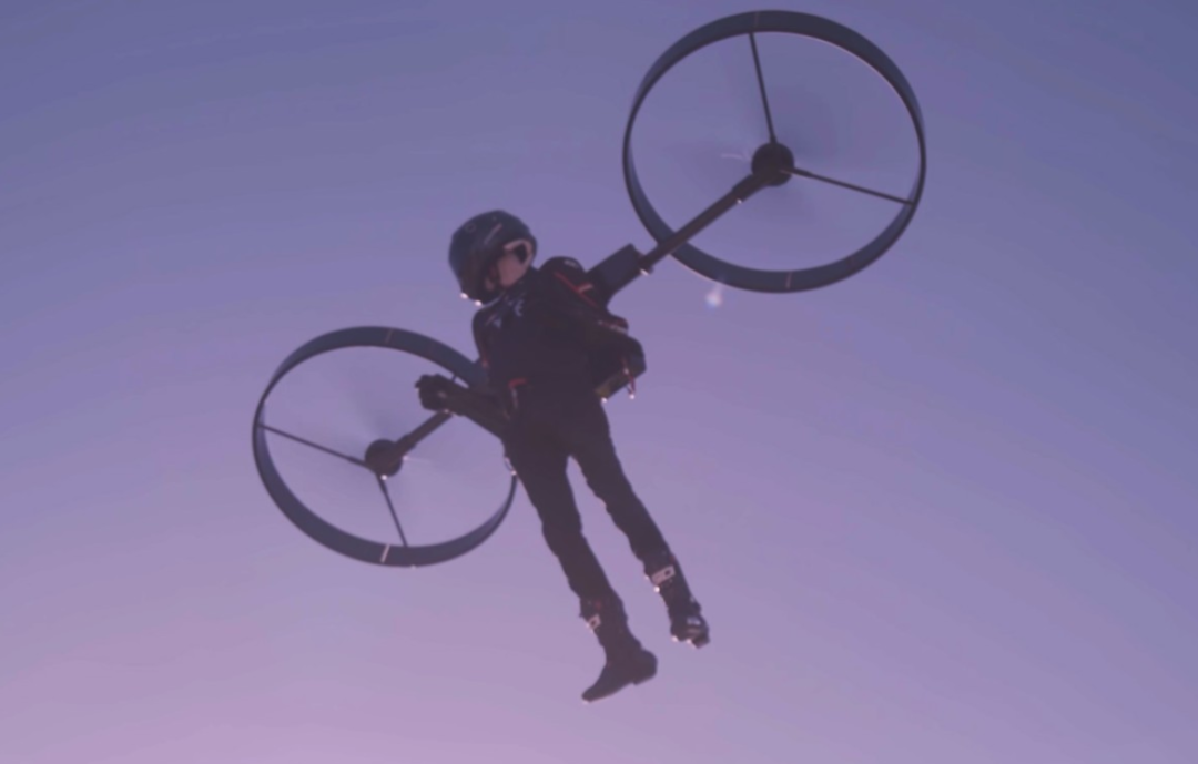 它只使用两个旋翼,但相当大,直径约90厘米。这些旋翼通过似乎是碳纤维管连接到一个刚性框架的背包上,背包下有一些电池组和一对平的扶手,上面有手控装置。