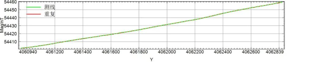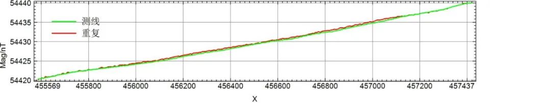 切割线与测线交点数:232,航磁数据经各项改正后计算航磁调平前总精度计算方法采用切割线与测线交点上磁场差值的总均方差σ为 0.1nT。
