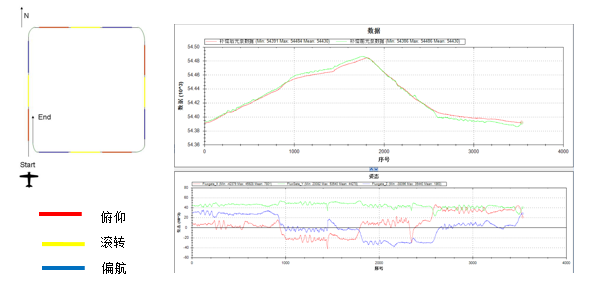 CW-25E铷光泵航磁系统航磁补偿:在至少高于地表 800 米以上的高空,在 0°、90°、180°、270°四个方向上做定点机动,记录航磁数据记录,如下图所示。进入机动前导距离400米,保证飞机状态稳定后机动操作进行每个飞行方向上3个俯仰(机动角度±5°)、3个滚转(机动角度±10°)和3个偏航(机动角度±5°)的机动,动作周期4秒,动作间隔1秒.软件计算出相应的航磁补偿参数,评估航磁补偿结果。航磁补偿结果达到要求后再沿设计测线飞行采集,直至完成所有测线,单一飞行试验结束。
