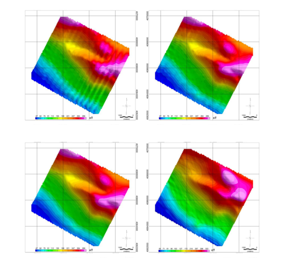 依次为补偿前、补偿后、调平后和化极异常平面图通过上图可以看出,补偿前的平面异常图条带状明显,为典型的航磁异常特征,但优于以往航磁数据,补偿后条带状明显改善,经简单调平后,线性条带消失,可以作为异常解释的基本图件。