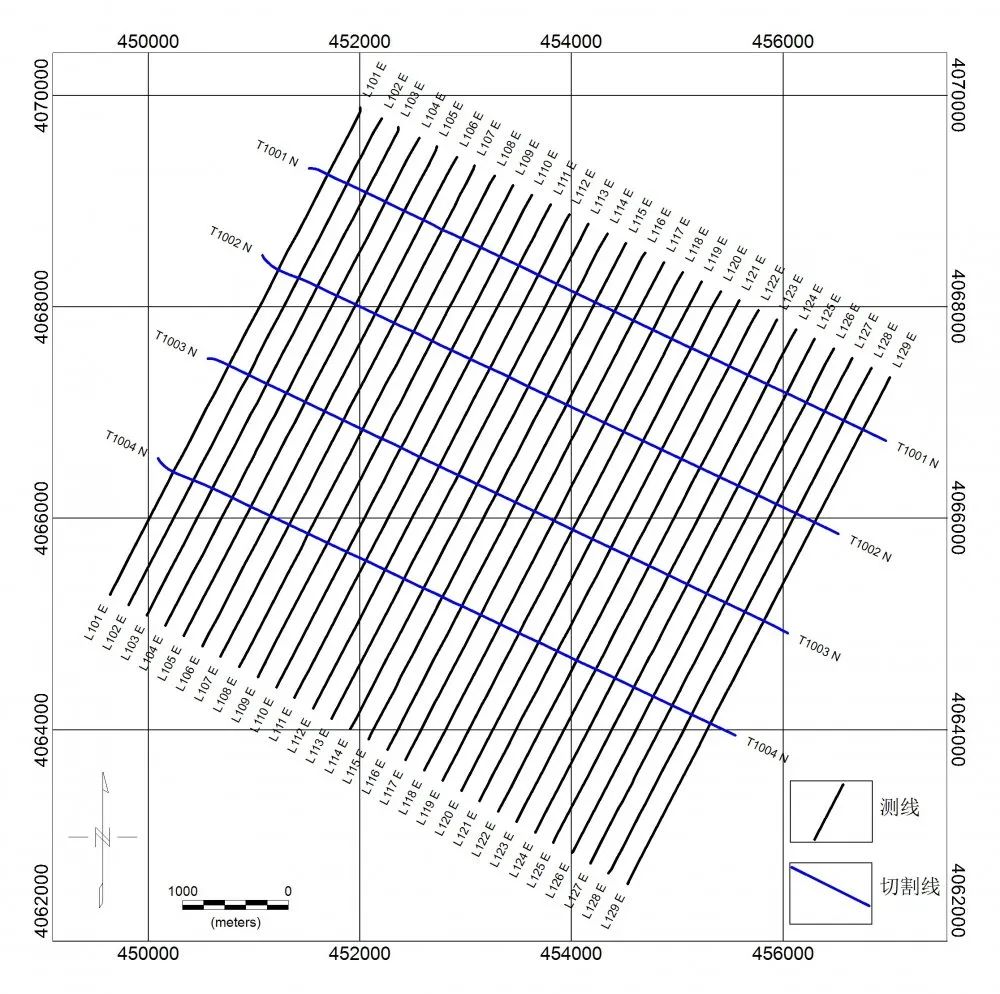 航磁补偿轨迹示意图,光泵补偿前后及磁通门数据剖面图本次航磁测试参考国家标准《航空磁测技术规范DZ/T0142—2010》进行评判。补偿后标准差为0.03nT,满足规范5.13.5条“要求补后标准差优于0.08nT”。CW-25E铷光泵航磁系统航磁测线数据采集:CW-25E铷光泵航磁系统进行航磁数据采集。总共进行2架次飞行,完成4边机动,十字线及29条测线,飞行测线从西到东完成,其中:L101-L129为主测线,T1001-T1004为控制线。