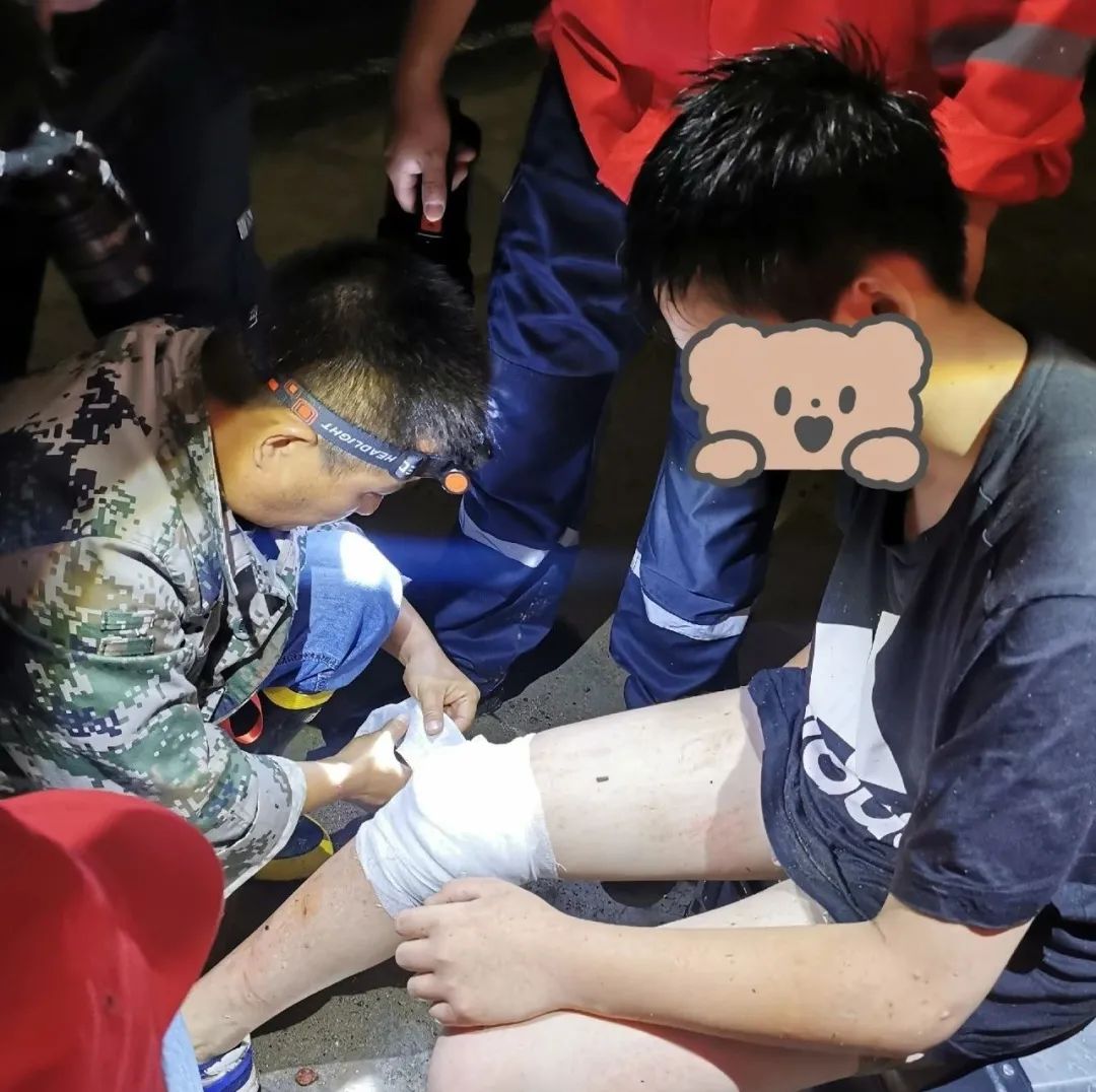原来,为躲避民警及家人的搜寻,男孩不断变更藏身地点,还穿越了村中横穿的大溪,膝盖轻微擦伤。救援队员赶紧拿出随身的急救箱,悉心为男孩包扎。
