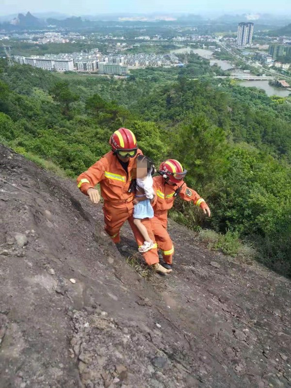 经过一番攀爬,3名救援人员来到失踪女孩身边,成功将其救下。