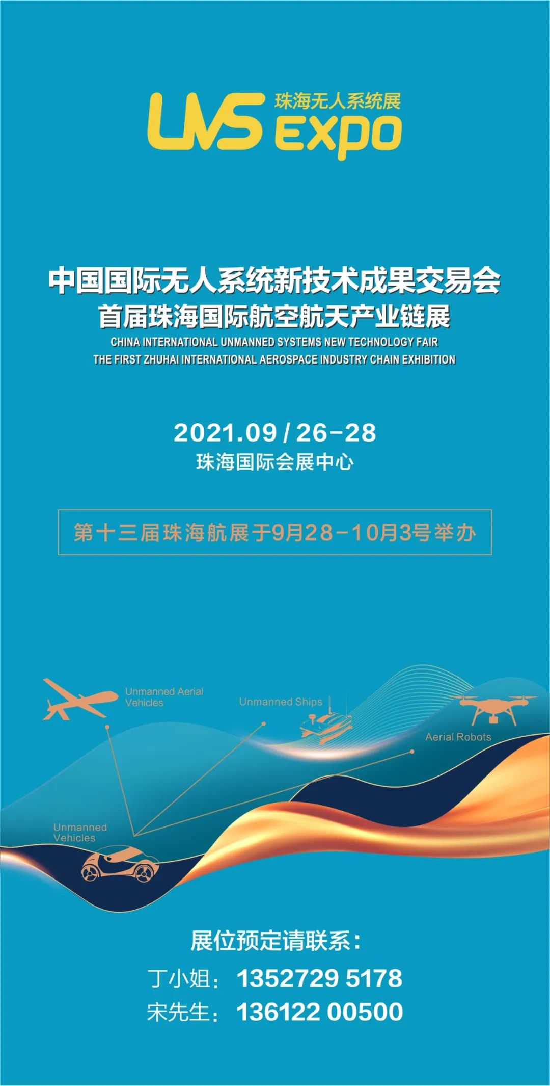 中国国际无人系统新技术成果交易会依托珠海航展,创始于2016年的珠海国际无人机博览会,迄今已成功举办三届,已发展成为国内影响力最大的权威专业展会。为打造粤港澳大湾区航空航天产业链专业化平台,深化产业合作,今年大会同期首次举办“2021珠海国际航空航天产业链发展峰会”和“2021首届珠海国际航空航天产业链展”,为粤港澳大湾区航空航天产业集群发展注入强劲动能,现正接受企业参展报名。丁小姐13527295178,宋先生13612200500。