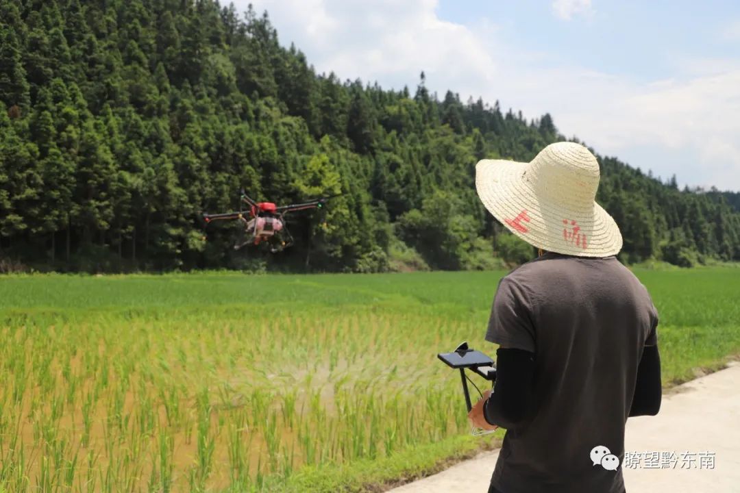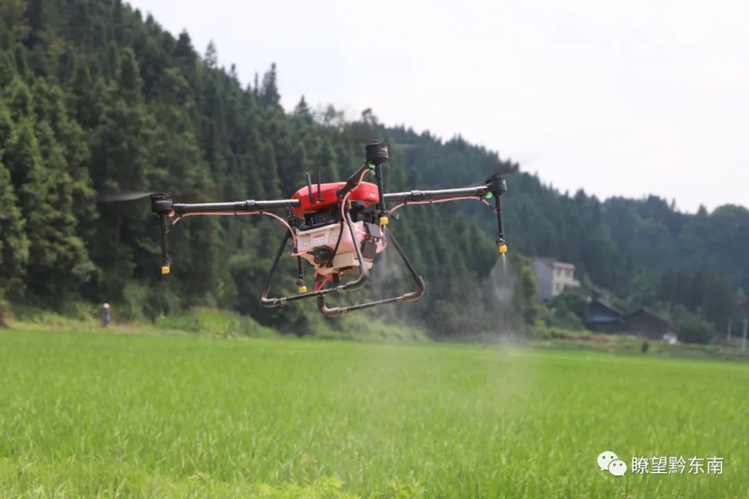6月23日,在贵州锦屏县铜鼓镇嫰寨村的稻田上空,植保无人机正在进行水稻病虫害飞防作业。