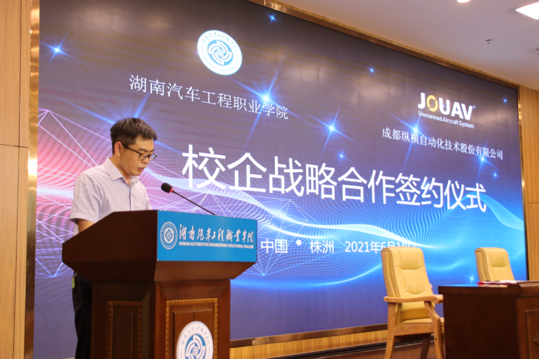 湖南汽车工程职业学院党委委员、副校长欧阳波仪、校企合作处处长龙明才、航空工业学院院长杨升平、教授帅新国,纵横股份营销总监原波、纵横无人机学院院长杨锐等出席了签约仪式。
