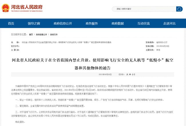 近日,河北省政府网站最新发布《河北省人民政府关于在全省范围内禁止升放、使用影响飞行安全的无人机等“低慢小”航空器和其他物体的通告》,详情如下↓↓↓