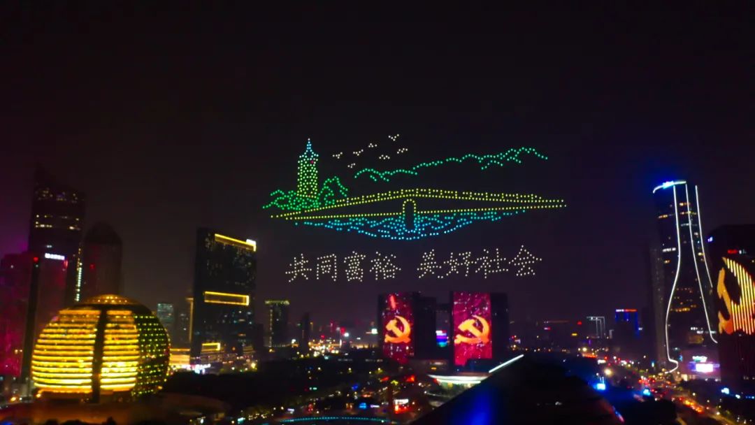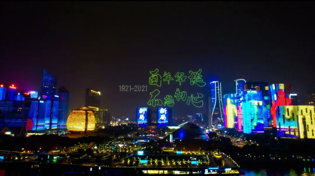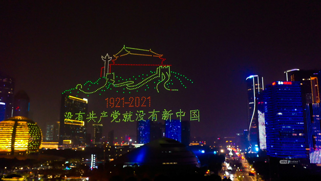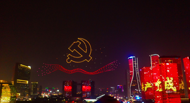 1000架无人机光影交错,呼应演绎奋斗百年路。“百年华诞 不忘初心”、“没有共产党就没有新中国”、红船精神的演绎以及共产党党徽等文字图案展现着中国革命的波澜壮阔。