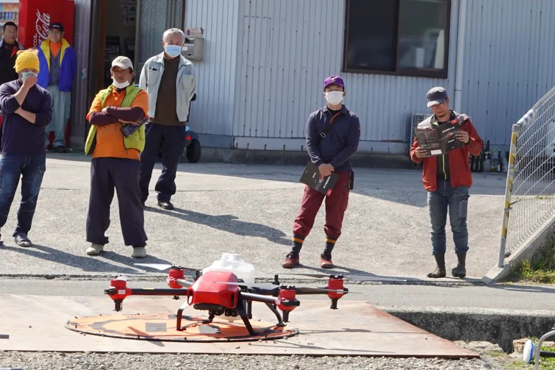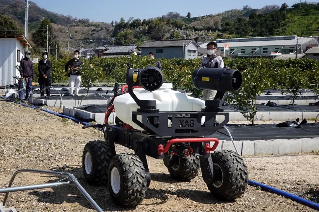 另外,爱媛县常年的暴雨洪涝等灾害,导致果园道路被毁,使普通农业设备难以进入果园;暴雨还容易使原本布置在果园的农药喷头发生故障,无法工作。面对此类极端天气,橘农们需要专业的设备来帮助他们,在灾后尽快恢复果园生产。近日,爱媛县宇和岛市橘农利用极飞农业无人机和 R150 农业无人车对柑橘进行空地联合立体式植保作业,受到附近农户到场围观。