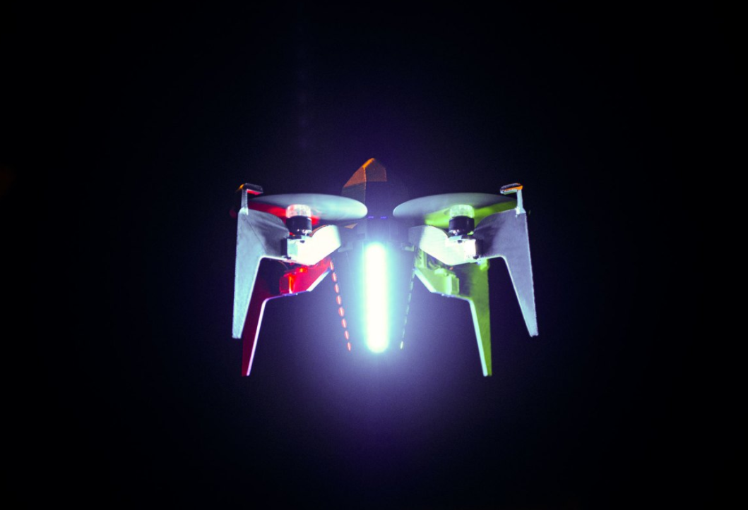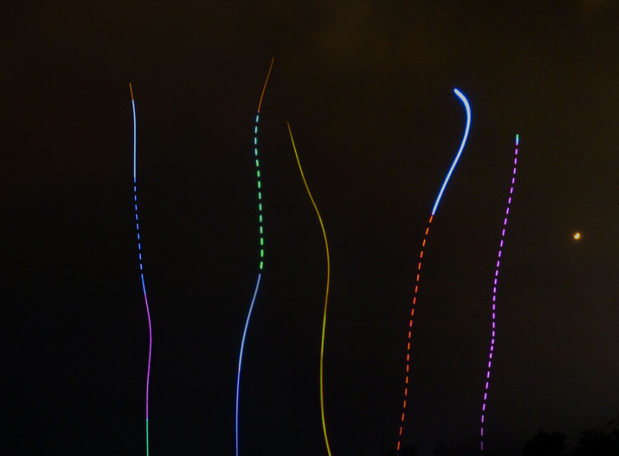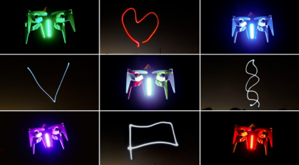 此外,最多可以对五架电动LED火箭无人机进行编程,使其作为一个编队一起工作,以创造更精细的灯光表演。每架无人机重90克,电池每充电30秒可在LED全功率下飞行约1分钟,总光输出为3000流明。