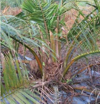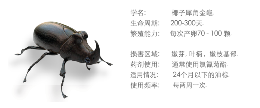 油棕病虫害多发生在树心部位,幼龄油棕受椰子犀角金龟,别名犀牛甲虫等害虫侵害树心后,会导致叶子受损、叶柄孔洞和长矛断裂或折断,从而导致树木变形和干枯,最终导致幼年油棕树过早死亡。