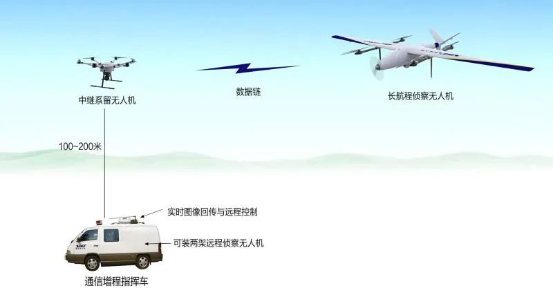 针对于上百公里的巡查任务,智航配备了通信增程指挥车,该车可以装载2台V330pro“侦察兵”和1台中继系留无人机, 通过系留无人机搭载信号中继可在100-200米的高空为“侦察兵”提供更好的通讯链路,使其飞的更高、看的更远。