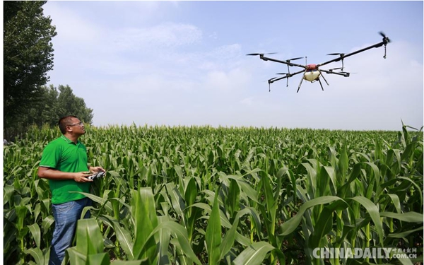 8月2日,河北省阜城县乡鑫粮食种植专业合作社工作人员操作植保无人机对玉米田进行喷药作业。(图片来源:新华社)