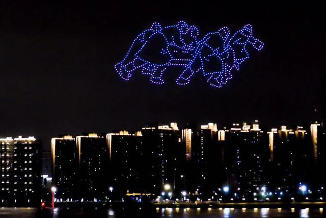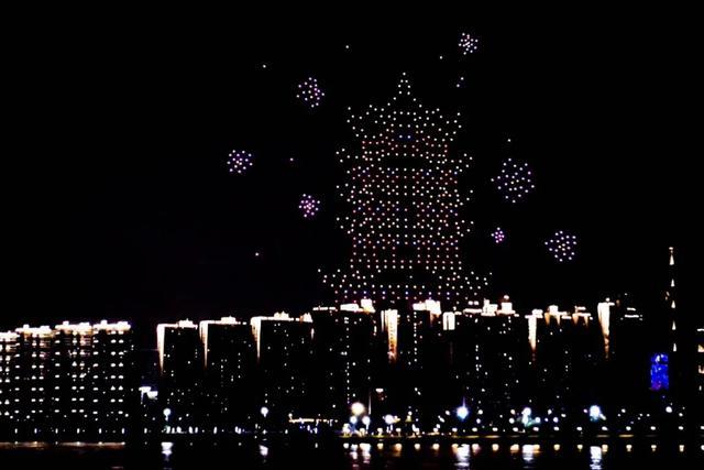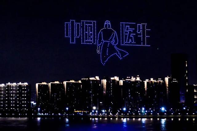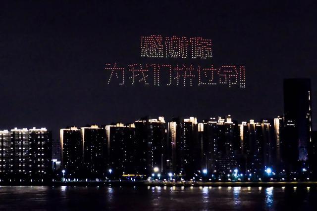 在璀璨的灯光中,600架无人机升空表演,献上夜空中最特别的致敬,只见夜空中变幻出,黄鹤楼、樱花等武汉标志。