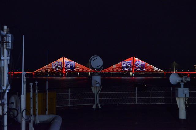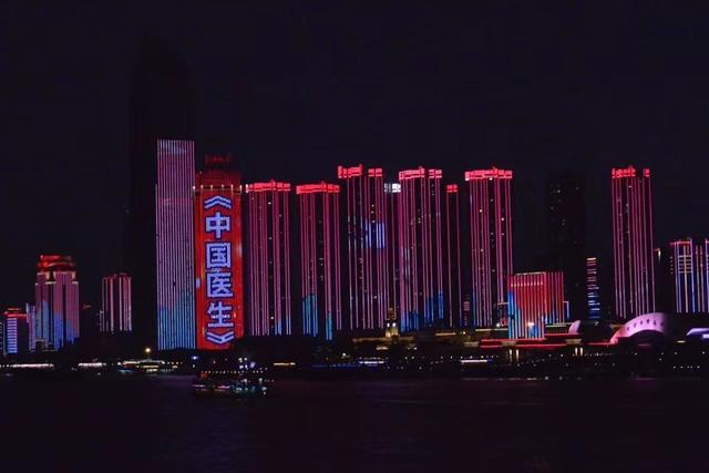 只见两江四岸的灯光秀,将江面映衬得一片火红,楼宇上齐刷刷出现字幕: