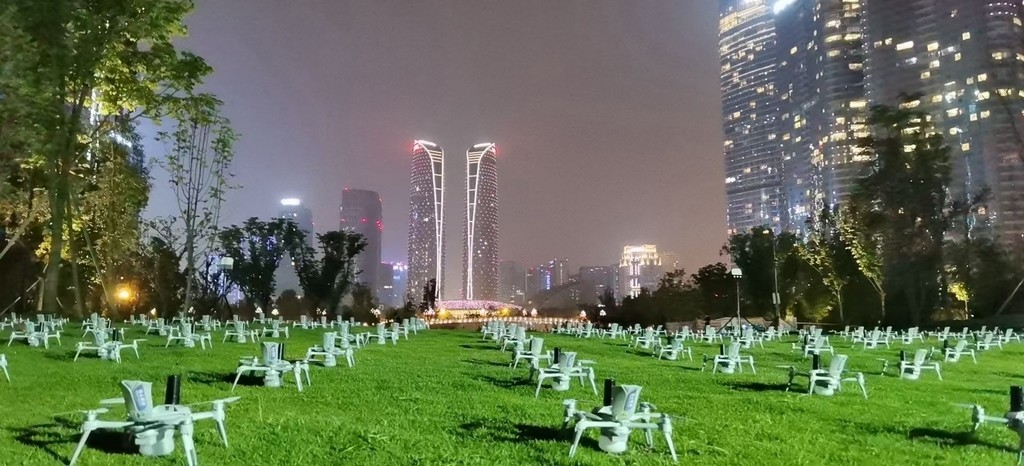 地形环境上,屋顶、坡度太大、有钢架结构的地方不能飞,金属的物品会对无人机的指南针系统带来干扰。天府双塔的表演共有550架无人机,当天就是在旁边的交子公园里选择了一块空旷草地,将编队机“排兵布阵”后直接升空。