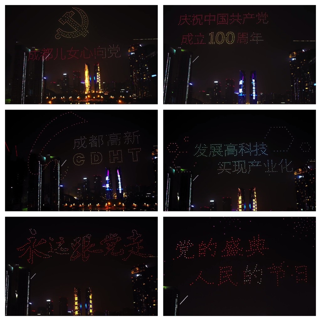 以夜空为画布,无人机编队徐徐升空,精准对时的配合着视频、灯光和音乐变化,展现出绚烂的党旗、党徽、100年等图案和文字……这是近一个月来全国各地的庆祝场景,也体现出科技美学。