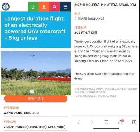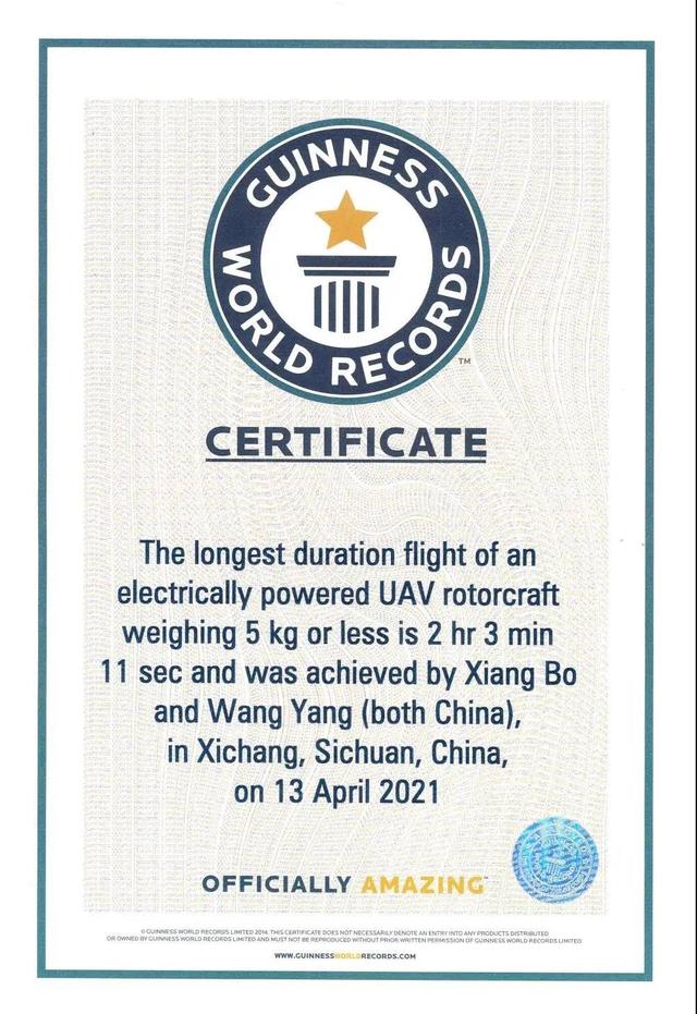 他们用自主研发的电池驱动的电动四旋翼无人机(起飞总重量小于5公斤),在海拔不超过1600米区域,无风或微风环境下起飞,飞行时间超过现吉尼斯世界纪录1小时51分51秒,达到了惊人的2小时3分28.87秒。