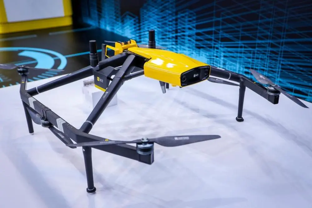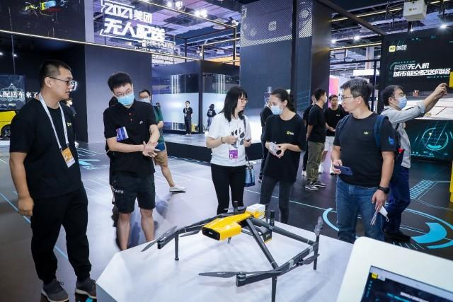 在上海举行的2021年世界人工智能大会上,一架美团无人机抓着一个快递箱