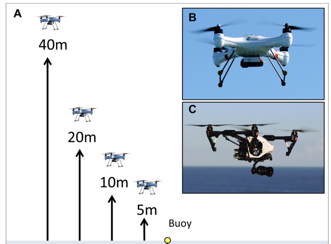 ▲不同高度下常见小型无人机所产生的噪声级、在海表面1m深所测量的接收声压级(模拟海表面鲸类所听到的噪声)