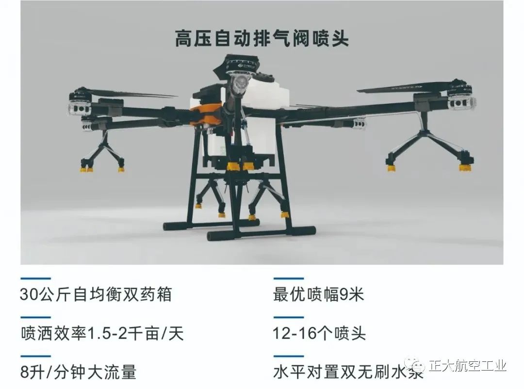 高压自动排气阀配合12-16个喷头超均匀,强沉降,抗漂移。采用水平对置双无刷水泵设计,为喷洒提供强劲动力,最高可提供8升/分钟的大流量。 一架F60农业无人机一天平均可作业1000 亩,效率是人工的 80-100 倍,大大缩短了作业周期。