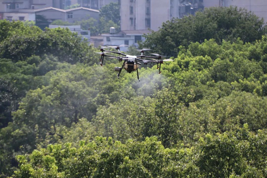 7月15日,和平公园管理处邀请专业的植保无人机企业,对园内的高大乔木开展病虫害飞防作业。