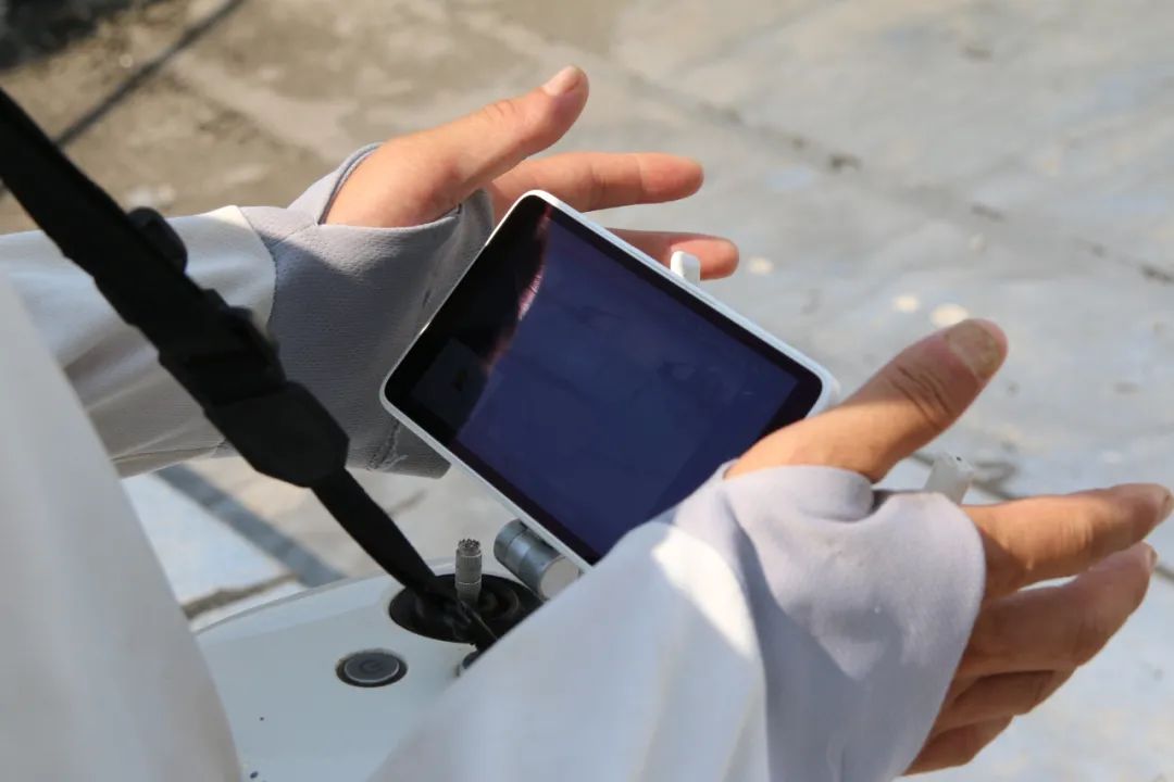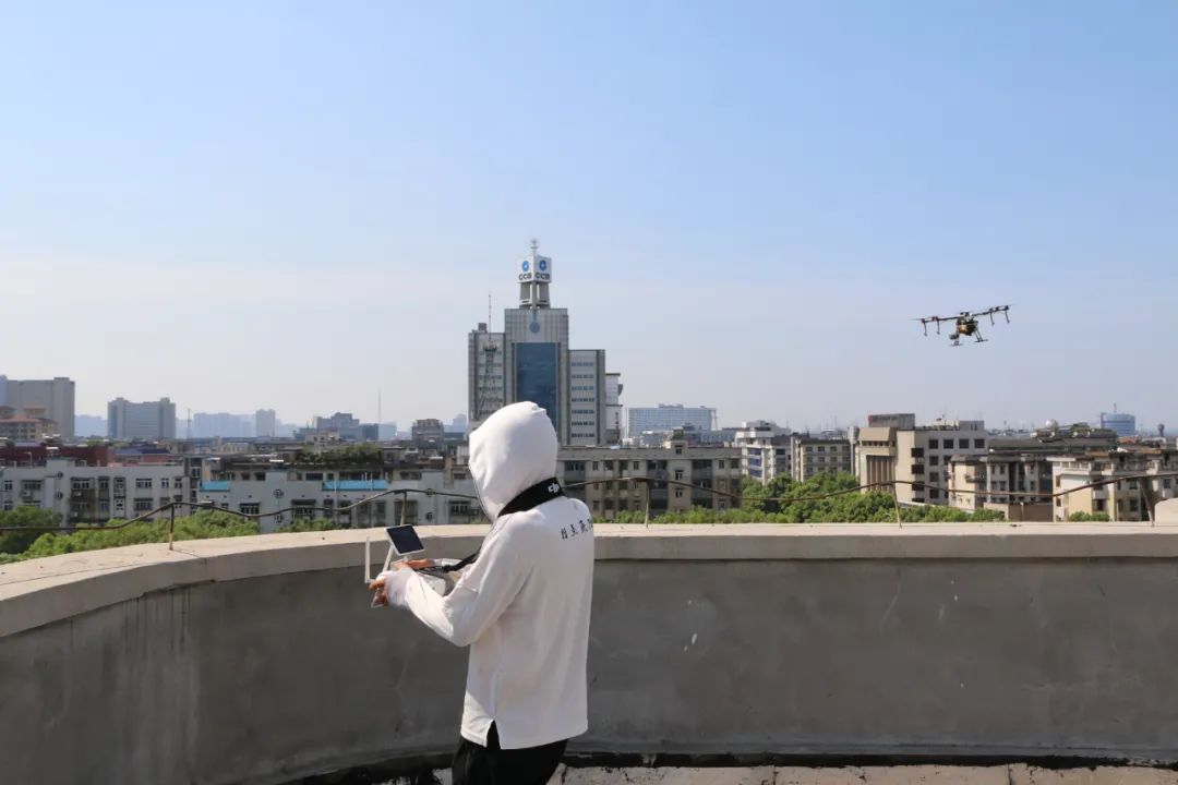 在和平公园旁的一栋高楼楼顶,无人机飞手居高临下进行飞行作业。由于乔木高矮不一,不能采取按照设定好的时间、路线喷药作业,需要全程依靠飞手的手动操作。