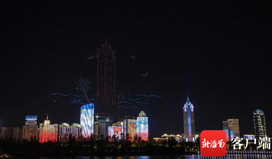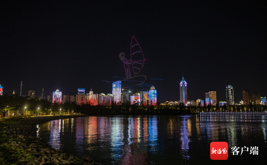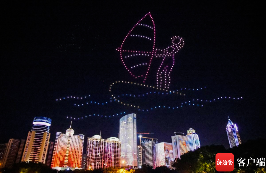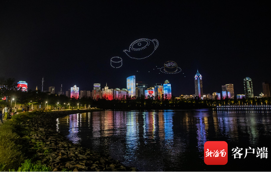 7月16日晚,520架无人机光影秀“点亮”椰城夜空。记者刘洋 摄(镜像翻转)