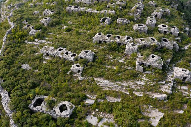 我曾经问过山脚下的村民,他们也是说法不一,有的说不知道何时所建,自古有之,有的说是清朝咸丰年间捻军作乱,村民为躲避兵祸在山上所建;也有人说,这里和大峰山齐长城的驻军有关,也为那个时代的兵营,但无论哪种说法,均说明这处遗迹都是文物古迹,值得保护起来,也是研究周边历史文化的重要载体。前几年虽然来过此地,但是那是从地面看的,虽然感觉房子有上百个,但是没有无人机从空中看来的震撼,而这次无意中让我再次看到这处古兵营,惊喜之余,再次感叹古人的聪明和智慧,这样一个孤立的山头,乱世之中建了这样一个伟大的工程,用以自保,虽然是无奈之举!