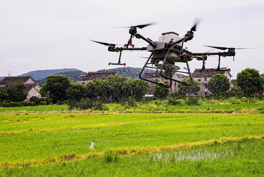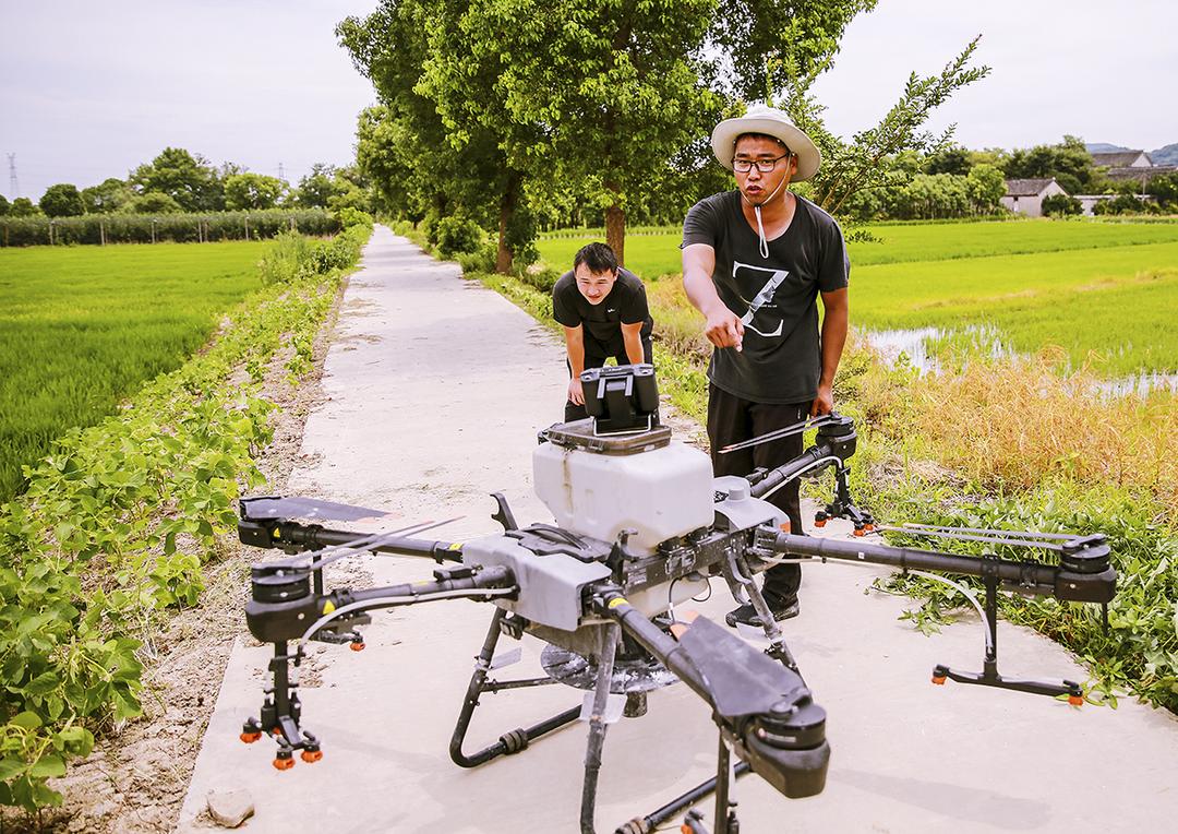 7月17日上午,在海宁市尖山新区(黄湾镇)闸口村的田野上,一架无人飞机在施化肥,引来许多村民驻足观看,现代农业自动化,极大地节省了农民的劳动力,生产效率大大提高。